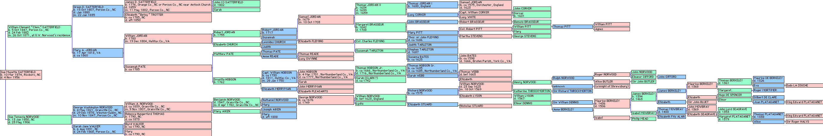 This site describes the families of my ancestors. If you want more information, or can contribute information or corrections, please e-mail me. This section contains links to six family charts; the major surnames in the charts are listed below. These charts have no links...use your browser to return back to this page. The BACON Ancestor Chart outlines families from eastern Virginia, and Kentucky (Todd Co.).Families include BACON, DICKINSON, WARE, HARRIS, ANDERSON, SANDIDGE, BOXLEY, BULLOCK, OVERTON, EDLOE, THORNTON, & TALIAFERRO.A few of these lines go back to England. Also included in this chart are two families from Connecticut who moved to Elmira, Chemung Co., NY: WELLES, and BABCOCK. The GRADY Ancestor Chart outlines families from Virginia (Dinwiddie Co.) and North Carolina (Duplin Co.).Families include GRADY, FITTZ, OUTLAW, BARROW, ALDRIDGE, THOMAS, BARFIELD, WHITFIELD, LAWRENCE, & DAFNELL. The LAWRENCE line goes back to England. The KITCHIN Ancestor Chart outlines families from eastern Virginia and North Carolina (Granville, Edgecombe, & Halifax Co.).Families include KITCHIN, ARRINGTON, ALSTON, SMITH, HODGE, BRINKLEY, CROWELL, SANDIFUR, MACON, & ATHERTON.A few of these lines go back to England. The SATTERFIELD Ancestor Chart outlines families eastern Virginia, and North Carolina (Granville, Orange, & Person Co.).Families include SATTERFIELD, NORWOOD, JORDAN, WALKER, TROTTER, PATE, THOMAS, CHURCH, HOBSON, & AIKEN.Several of these lines go back to England. The STACK Ancestor Chart outlines families from Virginia, North Carolina, South Carolina, and Tennessee (Cheatham Co.).Families include STACK, MILES, PACE, BIGGER, PARDUE, DAVIS, SHAW, GUPTON, HUNT, & RACKLEY. The TRAVIS Ancestor Chart outlines families from eastern Virginia (Jamestown, Williamsburg, & Brunswick Co.).Families include TRAVIS, CLARK, STITH, HARRISON, WORTHAM, PARHAM, WALLER, MEBANE, MYRICK, & CHAMPION.A few of these lines go back to England.Also included in this chart is one family from Maryland: STANFORD.